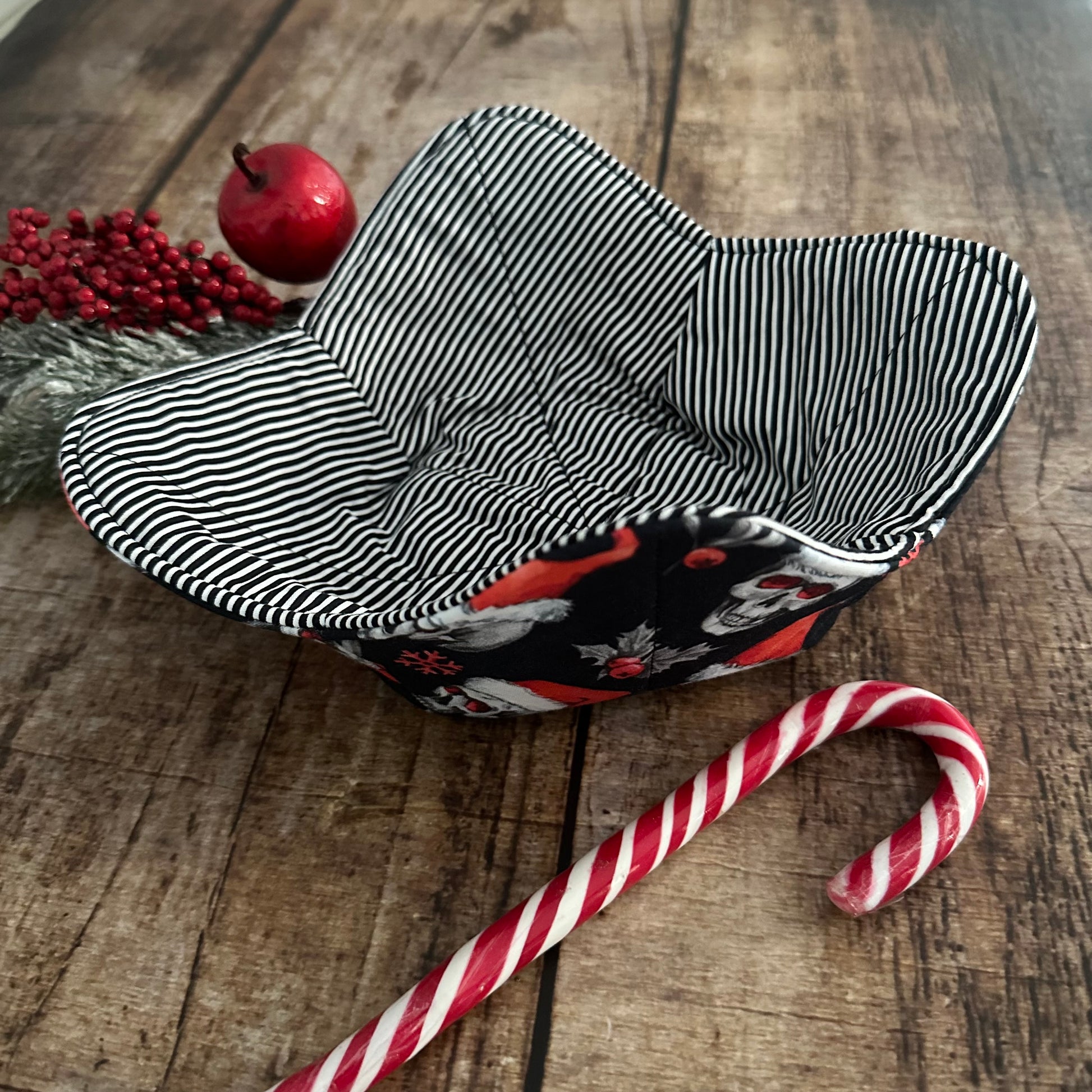 Der hitzebeständige Stoffuntersetzer schützt deine Hände und Oberflächen, während du es dir gemütlich machst – und sein auffälliges Design bringt dabei das perfekte „Dark Christmas“-Feeling in deine Küche. Eine Seite schwarze Baumwolle, detailreiche Totenkopf-Santas mit roten Mützen, Schneeflocken und Stechpalmenblätter – ein festlich-makabres Muster, das Weihnachten und Halloween auf charmante Weise vereint. Die andere Seite schmale schwarze und weiße Streifen. Und das Beste? du kannst beide Seiten verwenden. Ganz wie es dir beliebt.