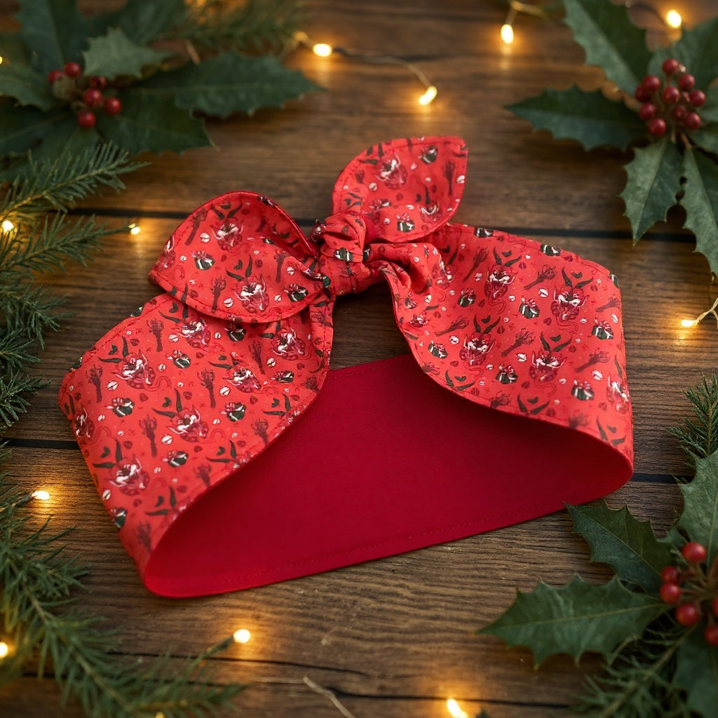 Haarband zum Binden mit einer Seite aus fester Baumwolle in blassem rot mit kleinen Krampus-Köpfen und weihanchtlichen Motiven. Die andere Seite ist in einem krÀftigen rot.