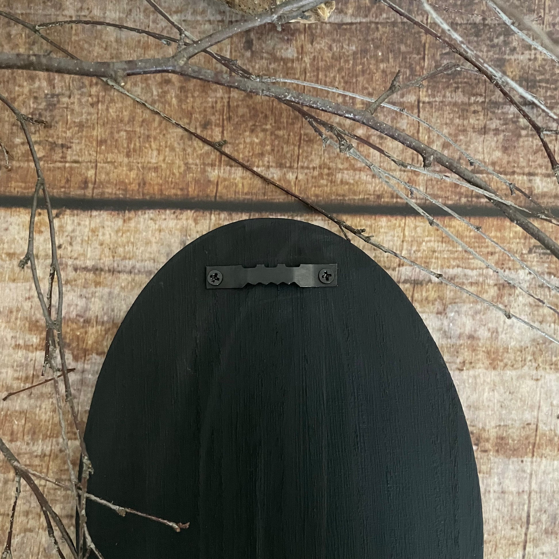 Ovales Holzschild zum Hinhängen. Perfekt als kleine Deko oder als Teil einer gallery wall.Schwarz lackiert mit Schriftzug 'Please do not summon demons in the bathroom' aus Vinylfolie.