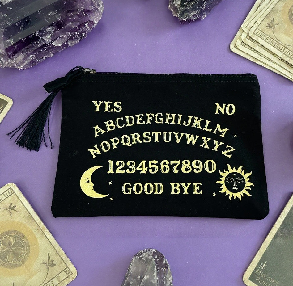Kosmetiktasche aus festen schwarzen Bio-Baumwolllcanvas mit einem goldenen Talking Board Aufdruck.